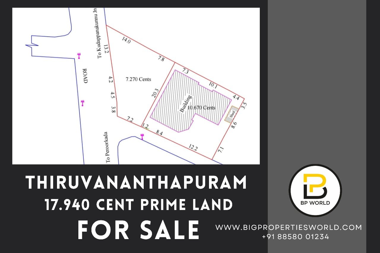 Presenting a prime commercial plot for sale in Trivandrum, featuring 18 cents of rectangular land with a posh and well-built house that boasts classic teakwood interiors and a beautifully landscaped front lawn. The property offers two-side road frontage and approximately six car parking spaces, making it highly suitable for commercial redevelopment or institutional use.